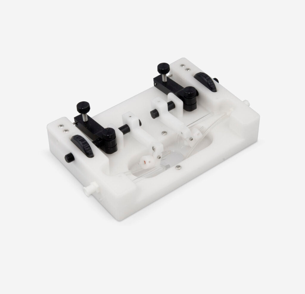 This axially rotating single vessel chamber rotates the vessel to image adjacent cell structures using confocal or Nomarski optics. This is useful for injections of caged agents and observation after inversion. The angled cannula holders bring the vessel close to the coverslip for simultaneous diameter and fluorescence measurements, and pressure and perfusion is maintained during the rotation.