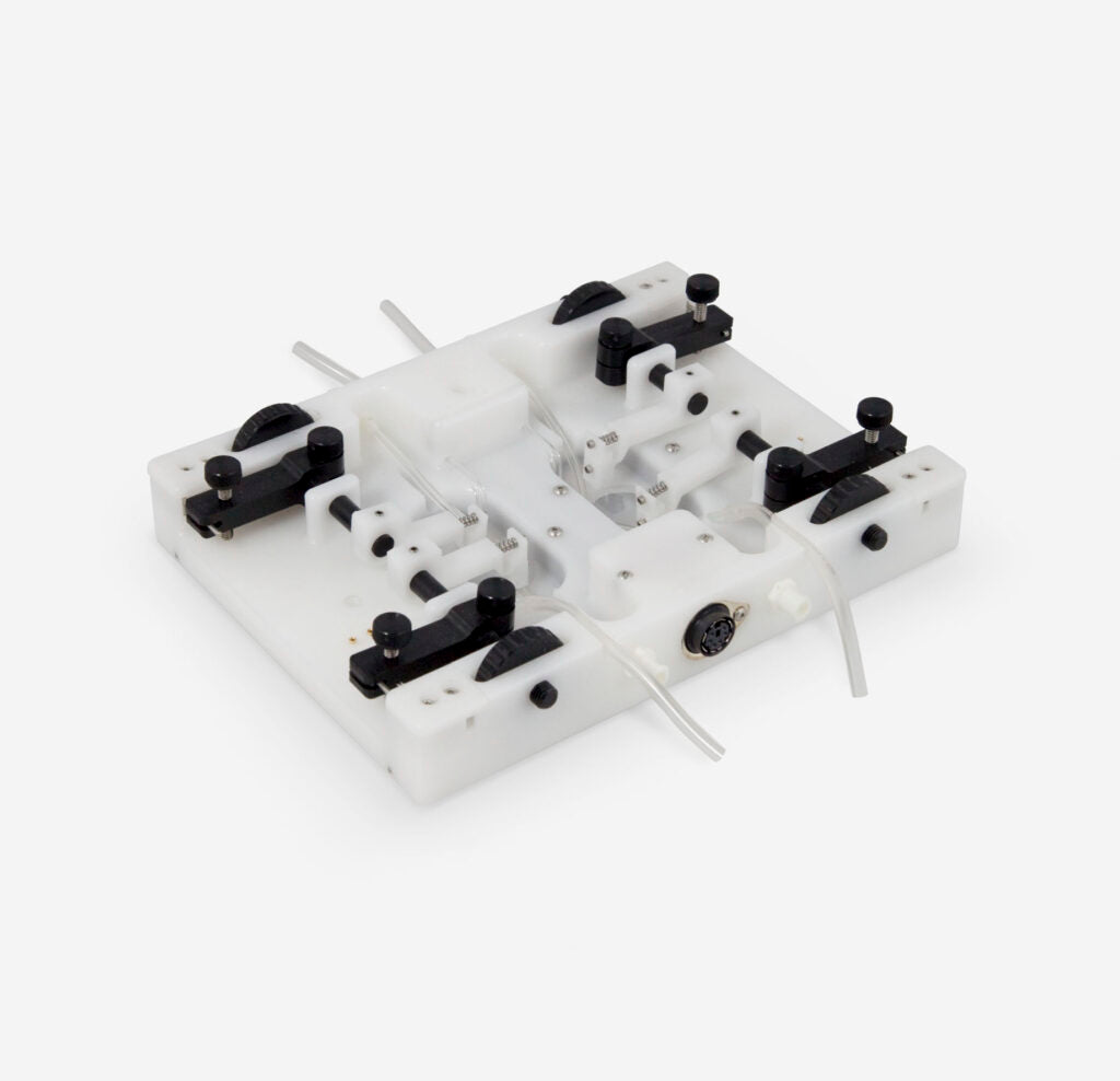 The CH-2 chamber is used to optimize experimental throughput, allowing two vessels to be mounted side by side. This chamber can be used for wide-field or confocal fluorescence microscopy, as well as standard transmitted light microscopy. The dual vessel chamber is ideal for bioassay work where perfusate from one vessel is routed to the adjacent vessel. It allows visualization of blood vessels as small as 30 µm in diameter. Our temperature controller (TC-09D) can be used to directly control or monitor bath temperature. For monitoring or controlling bath temperature, a bath thermistor sensor (THRS) is also required for each of the two vessel baths. See our self-heated dual vessel chamber package (LS-CH-2-SH) for self-heating temperature control applications.