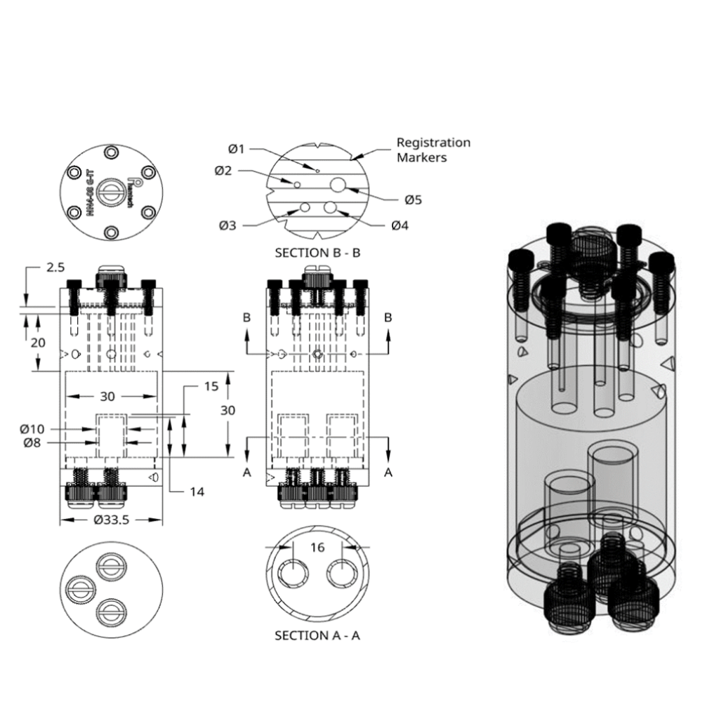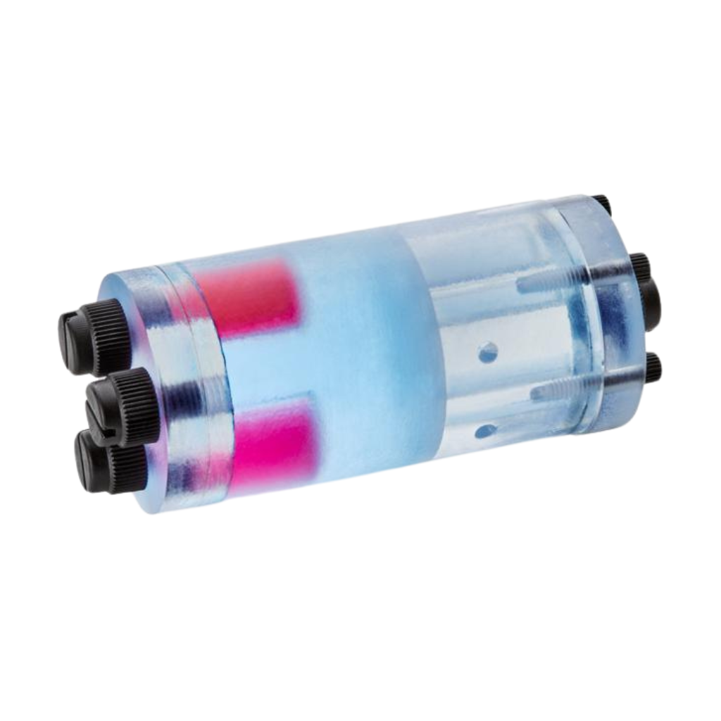 This assembly consists of three custom manufactured components (two of which are sealed permanently together) and four separate pieces of commercial hardware for assembly. This phantom has a hot rod region with five different sized rods and a large uniform region with two separately fillable chambers within it.