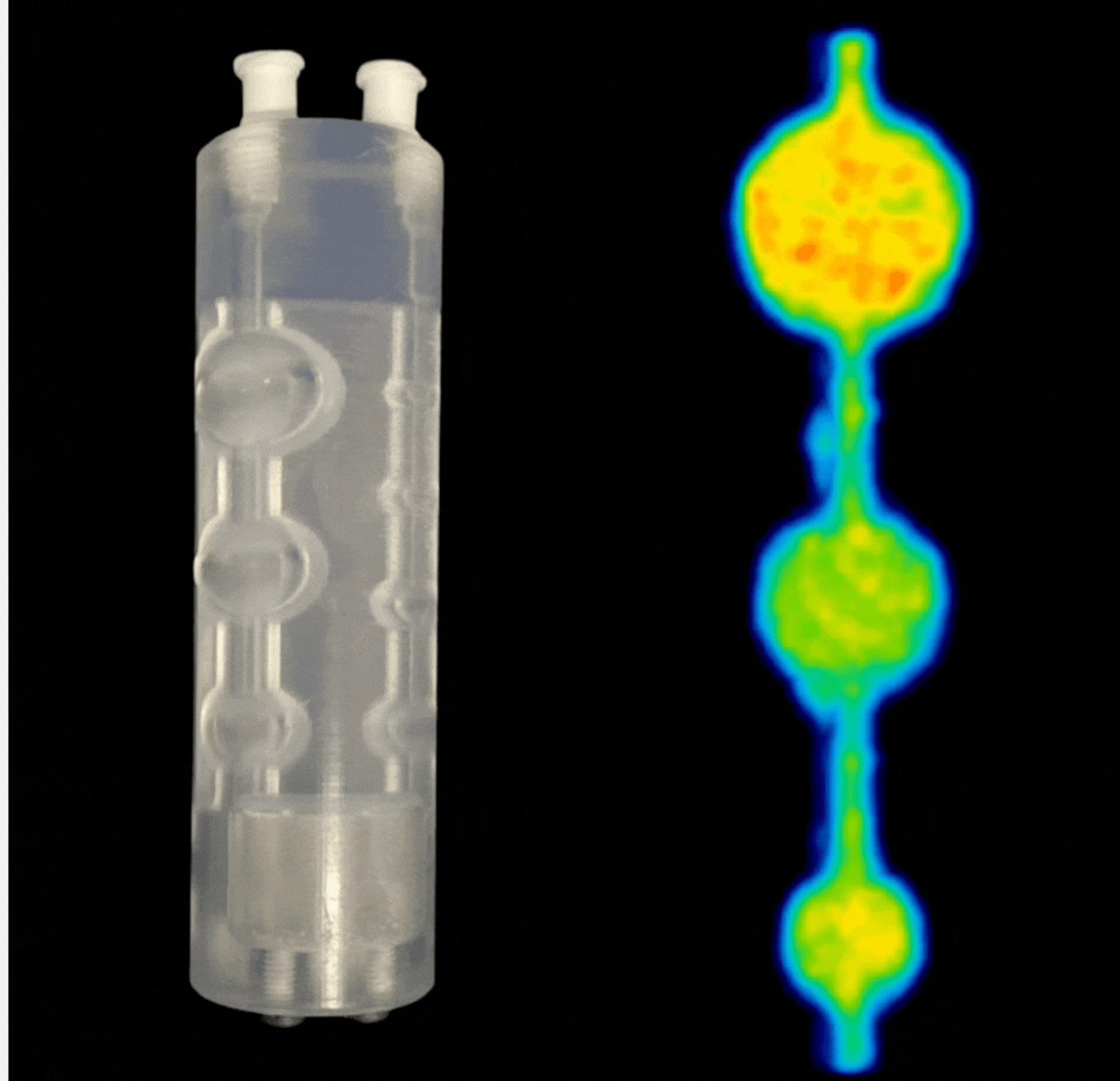 Our micro PVC phantoms are available in 3 sizes (27 mm OD, 34 mm OD, and 49 mm OD). The 27 mm OD version is shown below for more detail. All units are in mm unless otherwise noted. These phantoms consist of one custom manufactured component and three separate pieces of commercial hardware for assembly. They have three separate voids, one with a series of spheres for a contrast recovery curve, one with a separately fillable warm background, and a final separate reference volume that can be optionally filled.